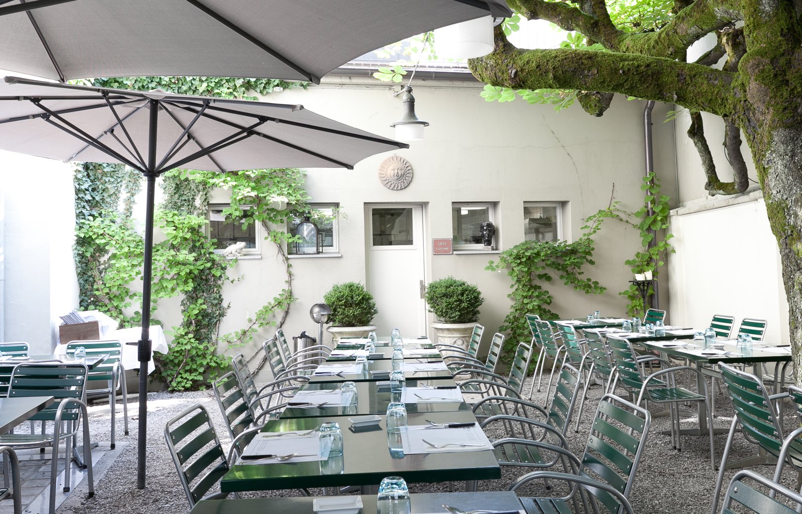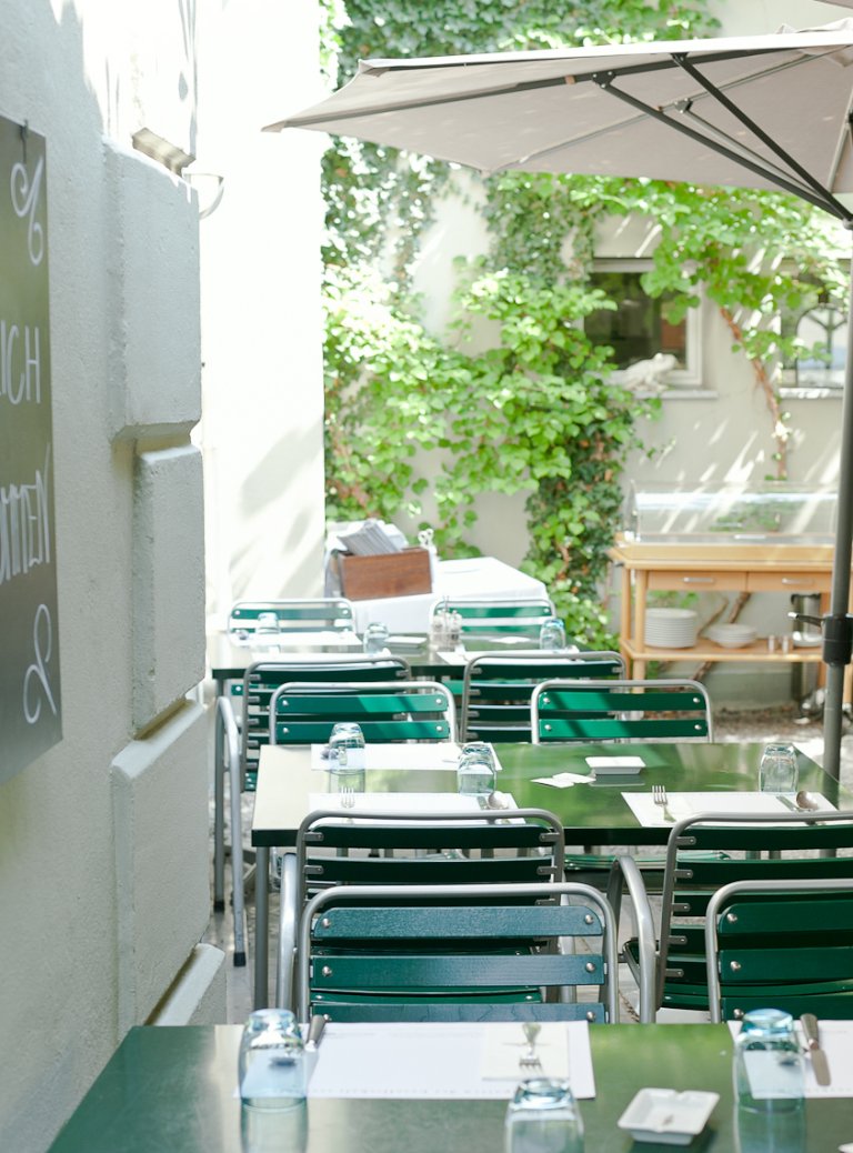 Ob am Morgen bei einem Kaffee, zum Zmittag mit feinen Tagesspezialitäten, bei einem Apéro oder bei einem Abendessen– in unserer schattigen Stadtoase lässt sich sogar das Meer herbei träumen. Wenn man so will.